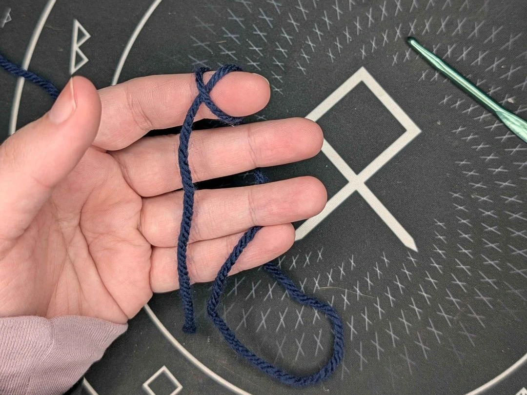 Lay the tail end of your yarn across your left palm, holding it down with your thumb. Wrap the working yarn around your index finger to form an "X" facing you with the yarn.