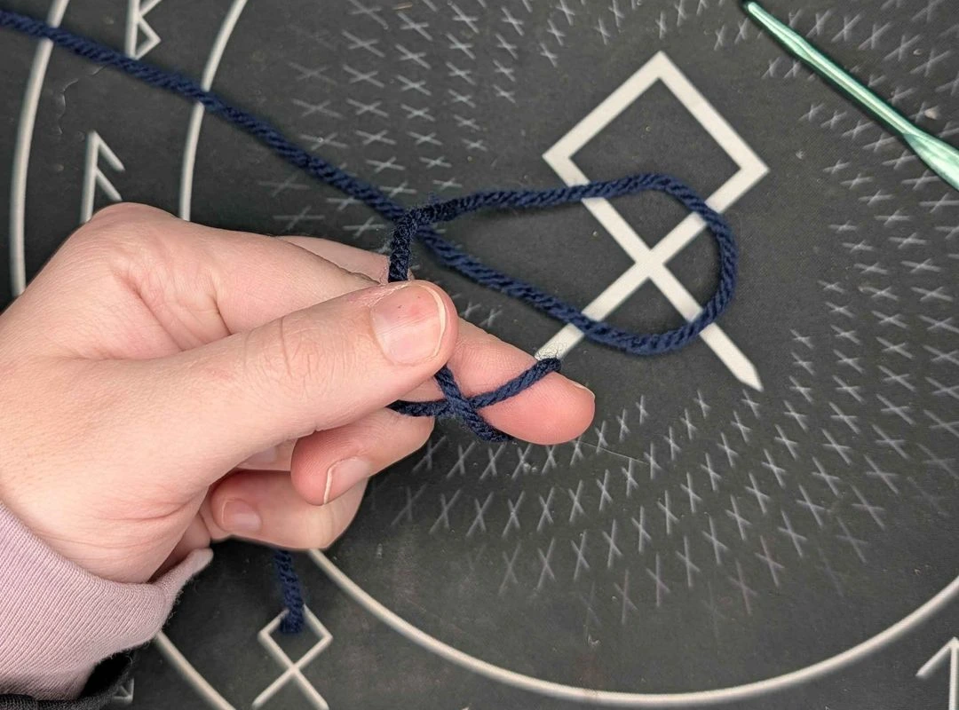 - Still holding the X with your left hand, pull the working thread through the loop on your hook, just like a chain stitch. And voila! Your MR is complete. You can now completely let go with your left hand, and if you hold up your hook and it doesn't come loose, you've done everything correctly.
